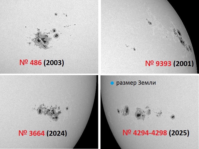 Южная группа солнечных пятен, вышедшая к Земле двое суток назад, достигла самых больших размеров в текущем году. Суммарная площадь комплекса, измеренная в начале дня, равна 1600 единиц, что пока составляет около 60 % от размеров самых крупных групп пятен в XXI веке (значения около 2800 единиц), но уже на треть больше, чем прежний рекорд года в 1200 единиц, достигнутый в мае 2025 (область № 4079).