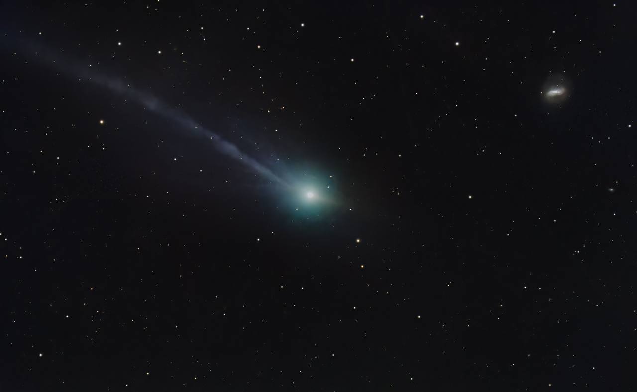 Вот этот шикарный кадр — конечно, это сумма из 24-минутных экспозиций — показывает сложную структуру газового хвоста и намек на формирующийся пылевой хвост. Ложный короткий антихвост тоже все еще виден. Справа от кометы находится галактика NGC 4691, расстояние до которой составляет 73 млн световых лет.